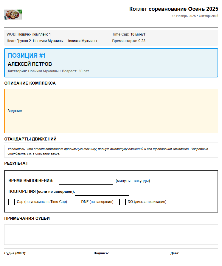 A[Участник завершает WOD] --> B[Судья записывает на бумаге]